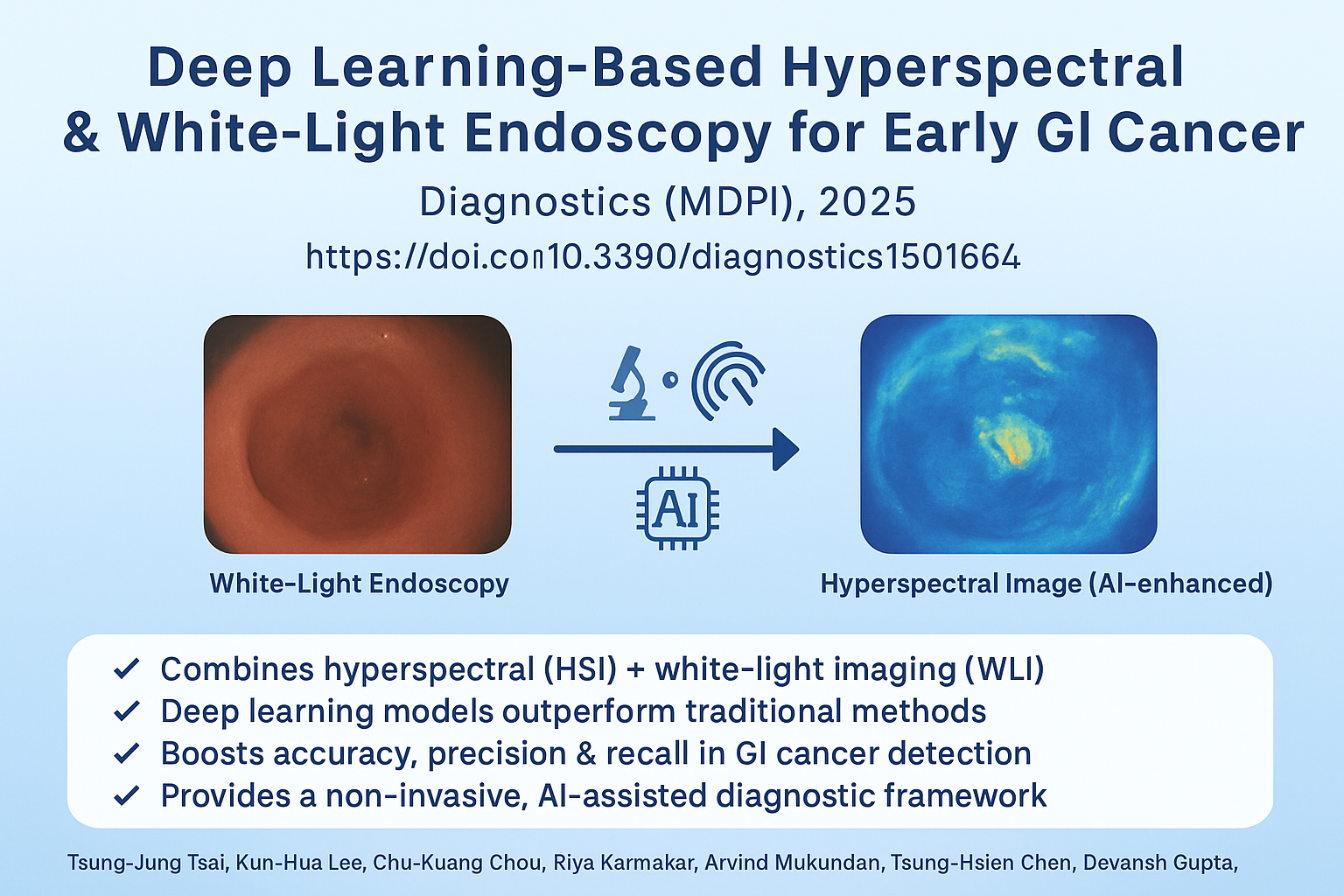 This study leverages deep learning models on both hyperspectral and white-light endoscopy images to improve the early detection of gastrointestinal cancers. Results demonstrate that combining hyperspectral imaging with neural networks significantly enhances classification accuracy compared to conventional imaging alone.