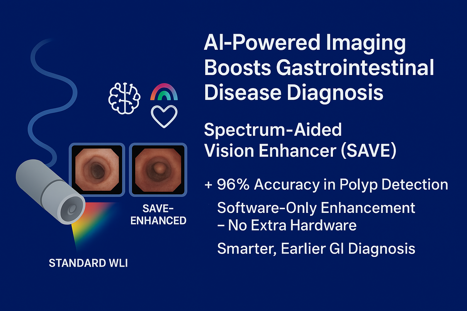 The study introduces the Spectrum-Aided Vision Enhancer (SAVE), a software-only method that converts standard endoscopy images into hyperspectral and narrow-band–like formats. SAVE, combined with deep learning, improved GI disorder detection—achieving up to 96% accuracy in polyp classification—offering a low-cost, non-invasive boost to early diagnosis.